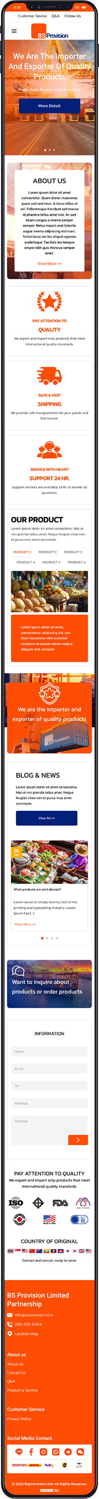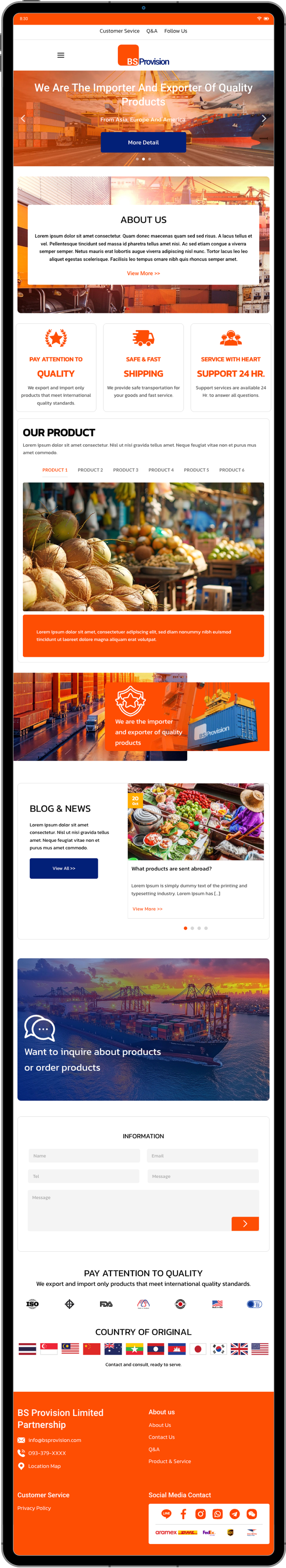 ห้างหุ้นส่วนจำกัด บีเอส โปรวิชั่น จัดจำหน่ายสินค้าอุปโภคบริโภค, วัสดุอุปกรณ์อุตสาหกรรม, และผลิตภัณฑ์เฉพาะทาง เเละมีระบบการจัดการคลังสินค้าและการขนส่งที่ทันสมัย เว็บออกเเบบให้โดดเด่นโดยใช้โทนสีส้ม
